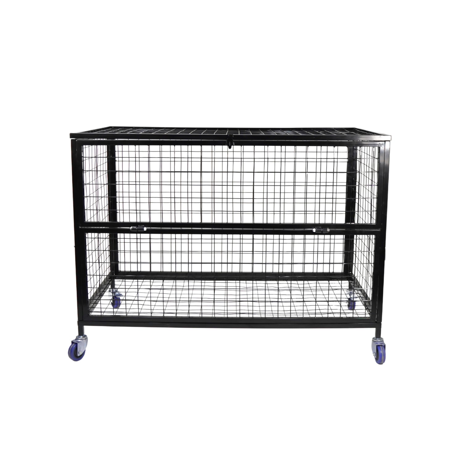 A heavy duty wire mesh storage trolley on four castors two of which are braked and with a drop down front section for ease of access. A retaining chain is provided on the lid.