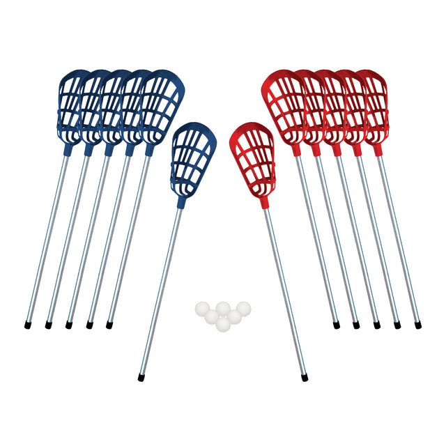Challenge young players with this fun hybrid set that blends elements of lacrosse and field hockey. The set includes 12 durable 42-inch bats (6 red, 6 blue) and 6 PVC balls (70 mm diameter) for versatile gameplay. Balanced for school or club use, it encourages hand-eye coordination, agility, and outdoor activity.