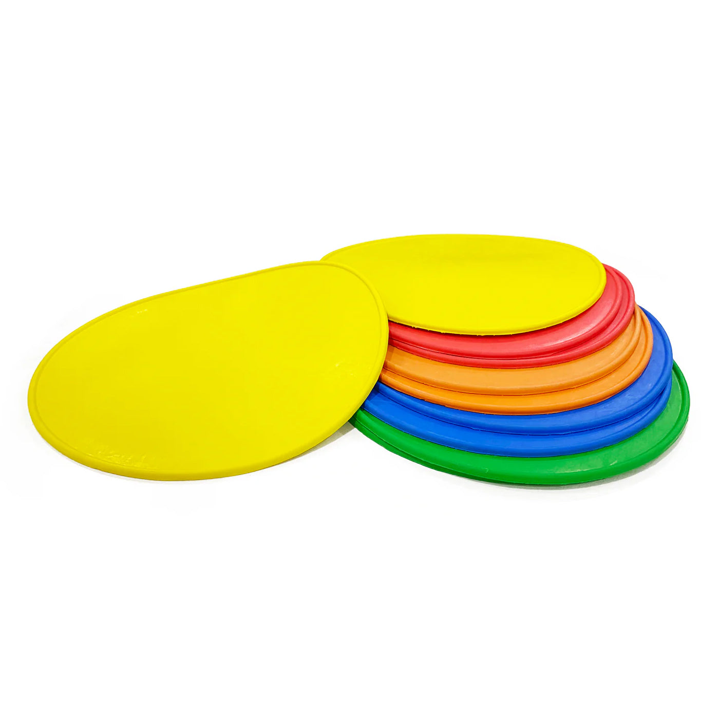 Set of 10 spot floor markers. Great for station games, to mark areas and as additions to obstacle courses. 2 of each colour (red, yellow, blue, green, orange). Made from durable non-slip rubber.